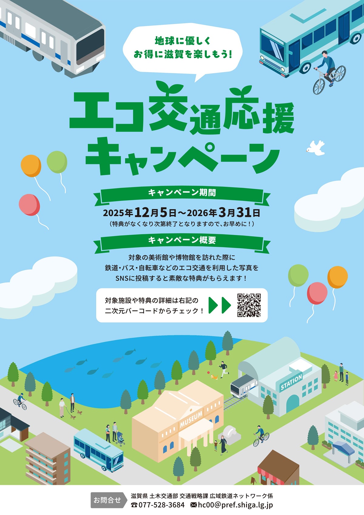 滋賀県内の対象の美術館や博物館を訪れた際に、鉄道・バス・自転車などのエコ交通を利用した写真をSNS(X・Instagram・Facebook・Threadsなど)に投稿すると素敵な特典がもらえるキャンペーンが開催中です。